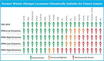 Kanadalı ve Avusturyalı bilim insanları tarafından yayınlanan ``Daha Sıcak Bir Dünyada Kış Olimpiyatlarının Geleceği’` başlıklı çalışmada bu yıl olimpiyatlara ev sahipliği yapan Soçi dahil olmak üzere 2050 yılına gelindiğinde birçok şehrin bu organizasyonlar için yeterince soğuk olamayacağı öngörüsünde bulunuluyor.