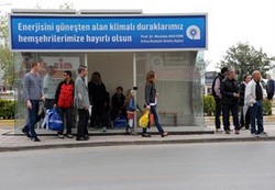 Antalya Büyükşehir Belediye Başkanı Prof. Dr. Mustafa Akaydın’ın seçim vaatleri arasında yer alan ‘Güneşkent Antalya’ projesi meyvelerini vermeye devam ediyor. Büyükşehir Belediyesi’nin Boğaçayı Atölyeleri’nde kendi imkanlarıyla ürettiği, enerjisini güneşten alan klimalı duraklar vatandaşlardan gelen yoğun talep doğrultusunda Antalya geneline yayılıyor. İlki Işıklar Caddesi üzerindeki Aslanlı Yol girişine kurulan klimalı durağın ikincisi Cumhuriyet Caddesi üzerindeki Cumhuriyet Meydanı durağına monte edildi.